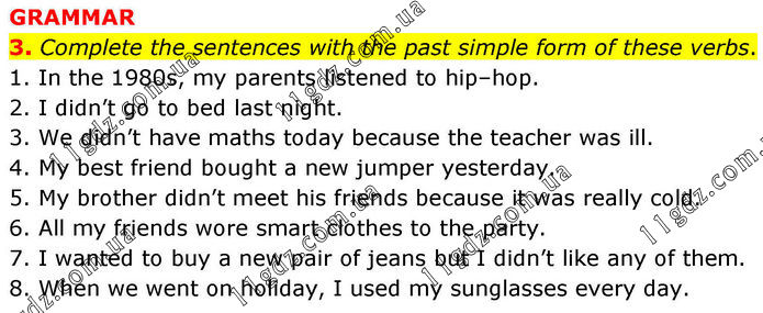 GRAMMAR 3. Complete the sentences with the past simple form of these verbs. 1. In the 1980s, my parents listened to hip–hop. 2. I didn’t go to bed last night. 3. We didn’t have maths today because the teacher was ill. 4. My best friend bought a new jumper yesterday. 5. My brother didn’t meet his friends because it was really cold. 6. All my friends wore smart clothes to the party. 7. I wanted to buy a new pair of jeans but I didn’t like any of them. 8. When we went on holiday, I used my sunglasses every day.
