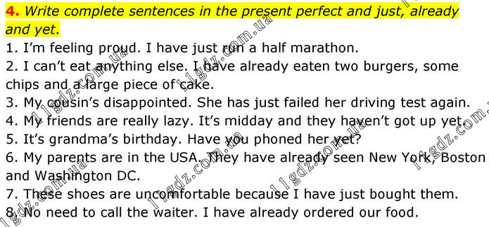 4. Write complete sentences in the present perfect and just, already and yet. 1. I’m feeling proud. I have just run a half marathon. 2. I can’t eat anything else. I have already eaten two burgers, some chips and a large piece of cake. 3. My cousin’s disappointed. She has just failed her driving test again. 4. My friends are really lazy. It’s midday and they haven’t got up yet. 5. It’s grandma’s birthday. Have you phoned her yet? 6. My parents are in the USA. They have already seen New York, Boston and Washington DC. 7. These shoes are uncomfortable because I have just bought them. 8. No need to call the waiter. I have already ordered our food.