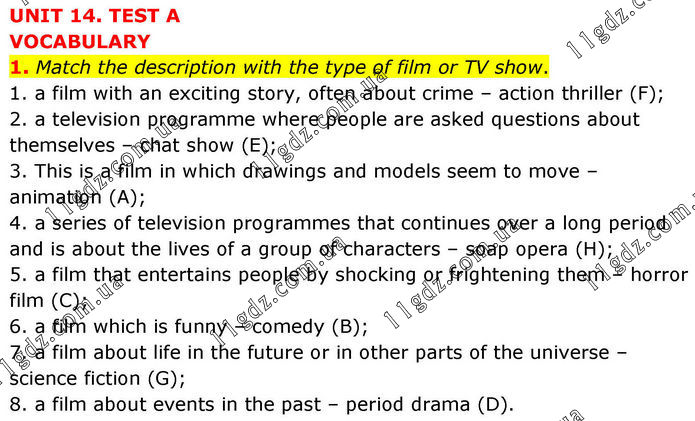 UNIT 14. TEST A VOCABULARY 1. Match the description with the type of film or TV show. 1. a film with an exciting story, often about crime – action thriller (F); 2. a television programme where people are asked questions about themselves – chat show (E); 3. This is a film in which drawings and models seem to move – animation (A); 4. a series of television programmes that continues over a long period and is about the lives of a group of characters – soap opera (H); 5. a film that entertains people by shocking or frightening them – horror film (C); 6. a film which is funny – comedy (B); 7. a film about life in the future or in other parts of the universe – science fiction (G); 8. a film about events in the past – period drama (D).