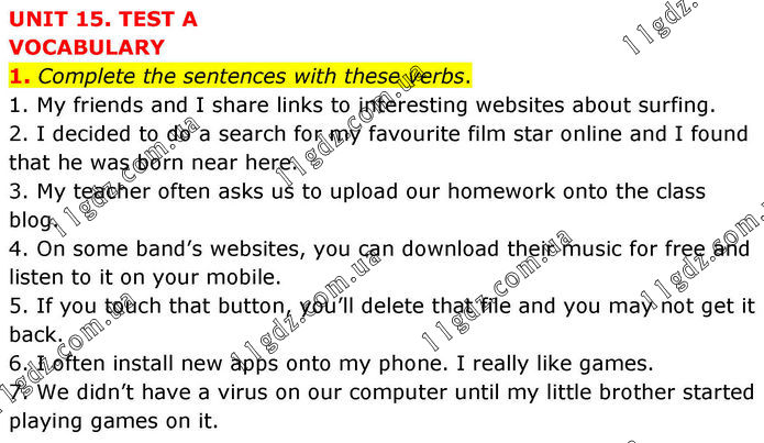 UNIT 15. TEST A VOCABULARY 1. Complete the sentences with these verbs. 1. My friends and I share links to interesting websites about surfing. 2. I decided to do a search for my favourite film star online and I found that he was born near here. 3. My teacher often asks us to upload our homework onto the class blog. 4. On some band’s websites, you can download their music for free and listen to it on your mobile. 5. If you touch that button, you’ll delete that file and you may not get it back. 6. I often install new apps onto my phone. I really like games. 7. We didn’t have a virus on our computer until my little brother started playing games on it.