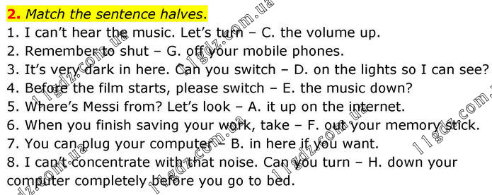 2. Match the sentence halves. 1. I can’t hear the music. Let’s turn – C. the volume up. 2. Remember to shut – G. off your mobile phones. 3. It’s very dark in here. Can you switch – D. on the lights so I can see? 4. Before the film starts, please switch – E. the music down? 5. Where’s Messi from? Let’s look – A. it up on the internet. 6. When you finish saving your work, take – F. out your memory stick. 7. You can plug your computer – B. in here if you want. 8. I can’t concentrate with that noise. Can you turn – H. down your computer completely before you go to bed.