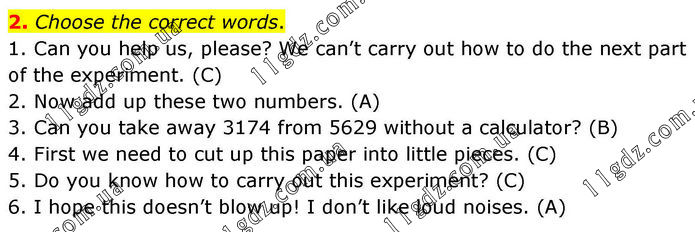 2. Choose the correct words. 1. Can you help us, please? We can’t carry out how to do the next part of the experiment. (C) 2. Now add up these two numbers. (A) 3. Can you take away 3174 from 5629 without a calculator? (B) 4. First we need to cut up this paper into little pieces. (C) 5. Do you know how to carry out this experiment? (C) 6. I hope this doesn’t blow up! I don’t like loud noises. (A)