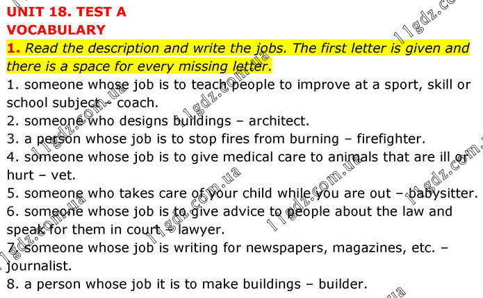 UNIT 18. TEST A VOCABULARY 1. Read the description and write the jobs. The first letter is given and there is a space for every missing letter. 1. someone whose job is to teach people to improve at a sport, skill or school subject – coach. 2. someone who designs buildings – architect. 3. a person whose job is to stop fires from burning – firefighter. 4. someone whose job is to give medical care to animals that are ill or hurt – vet. 5. someone who takes care of your child while you are out – babysitter. 6. someone whose job is to give advice to people about the law and speak for them in court – lawyer. 7. someone whose job is writing for newspapers, magazines, etc. – journalist. 8. a person whose job it is to make buildings – builder.