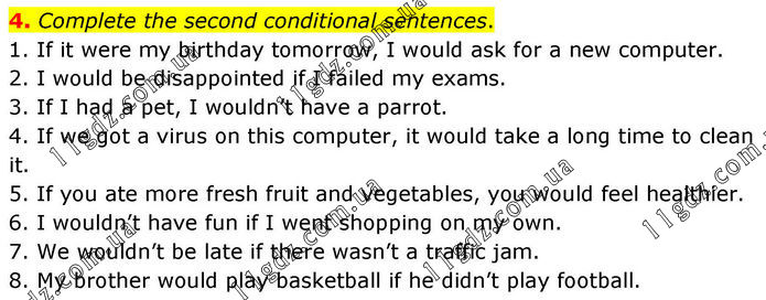 4. Complete the second conditional sentences. 1. If it were my birthday tomorrow, I would ask for a new computer. 2. I would be disappointed if I failed my exams. 3. If I had a pet, I wouldn’t have a parrot. 4. If we got a virus on this computer, it would take a long time to clean it. 5. If you ate more fresh fruit and vegetables, you would feel healthier. 6. I wouldn’t have fun if I went shopping on my own. 7. We wouldn’t be late if there wasn’t a traffic jam. 8. My brother would play basketball if he didn’t play football.