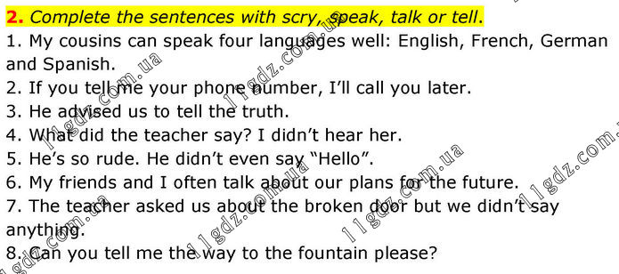 2. Complete the sentences with scry, speak, talk or tell. 1. My cousins can speak four languages well: English, French, German and Spanish. 2. If you tell me your phone number, I’ll call you later. 3. He advised us to tell the truth. 4. What did the teacher say? I didn’t hear her. 5. He’s so rude. He didn’t even say “Hello”. 6. My friends and I often talk about our plans for the future. 7. The teacher asked us about the broken door but we didn’t say anything. 8. Can you tell me the way to the fountain please?