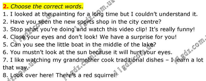 2. Choose the correct words. 1. I looked at the painting for a long time but I couldn’t understand it. 2. Have you seen the new sports shop in the city centre? 3. Stop what you’re doing and watch this video clip! It’s really funny! 4. Close your eyes and don’t look! We have a surprise for you! 5. Can you see the little boat in the middle of the lake? 6. You mustn’t look at the sun because it will hurt your eyes. 7. I like watching my grandmother cook traditional dishes – I learn a lot that way. 8. Look over here! There’s a red squirrel!