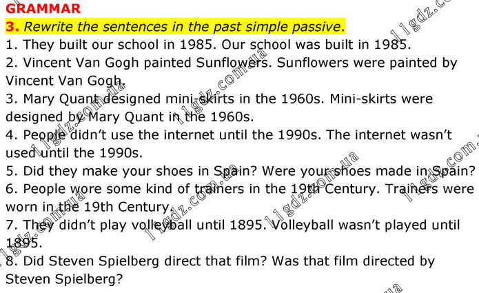 GRAMMAR 3. Rewrite the sentences in the past simple passive. 1. They built our school in 1985. Our school was built in 1985. 2. Vincent Van Gogh painted Sunflowers. Sunflowers were painted by Vincent Van Gogh. 3. Mary Quant designed mini-skirts in the 1960s. Mini-skirts were designed by Mary Quant in the 1960s. 4. People didn’t use the internet until the 1990s. The internet wasn’t used until the 1990s. 5. Did they make your shoes in Spain? Were your shoes made in Spain? 6. People wore some kind of trainers in the 19th Century. Trainers were worn in the 19th Century. 7. They didn’t play volleyball until 1895. Volleyball wasn’t played until 1895. 8. Did Steven Spielberg direct that film? Was that film directed by Steven Spielberg?