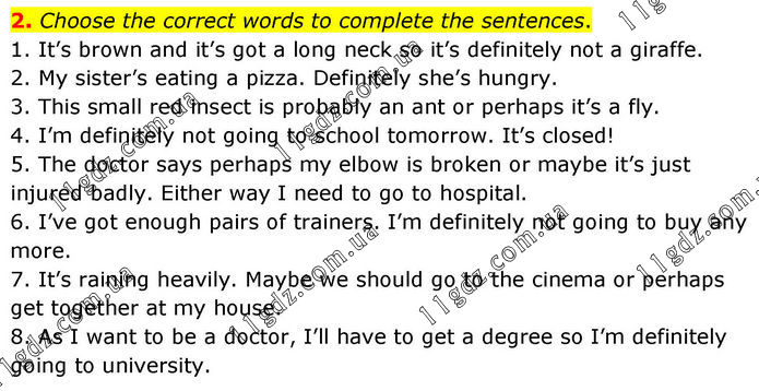 2. Choose the correct words to complete the sentences. 1. It’s brown and it’s got a long neck so it’s definitely not a giraffe. 2. My sister’s eating a pizza. Definitely she’s hungry. 3. This small red insect is probably an ant or perhaps it’s a fly. 4. I’m definitely not going to school tomorrow. It’s closed! 5. The doctor says perhaps my elbow is broken or maybe it’s just injured badly. Either way I need to go to hospital. 6. I’ve got enough pairs of trainers. I’m definitely not going to buy any more. 7. It’s raining heavily. Maybe we should go to the cinema or perhaps get together at my house. 8. As I want to be a doctor, I’ll have to get a degree so I’m definitely going to university.