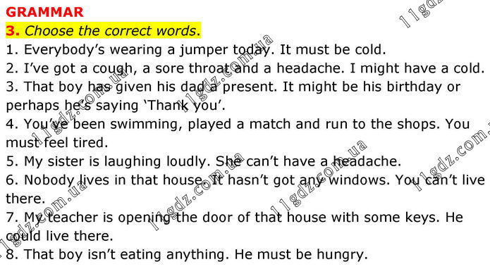 GRAMMAR 3. Choose the correct words. 1. Everybody’s wearing a jumper today. It must be cold. 2. I’ve got a cough, a sore throat and a headache. I might have a cold. 3. That boy has given his dad a present. It might be his birthday or perhaps he’s saying ‘Thank you’. 4. You’ve been swimming, played a match and run to the shops. You must feel tired. 5. My sister is laughing loudly. She can’t have a headache. 6. Nobody lives in that house. It hasn’t got any windows. You can’t live there. 7. My teacher is opening the door of that house with some keys. He could live there. 8. That boy isn’t eating anything. He must be hungry.