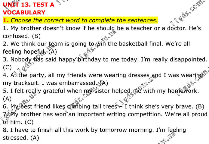 UNIT 13. TEST A VOCABULARY 1. Choose the correct word to complete the sentences. 1. My brother doesn’t know if he should be a teacher or a doctor. He’s confused. (B) 2. We think our team is going to win the basketball final. We’re all feeling hopeful. (A) 3. Nobody has said happy birthday to me today. I’m really disappointed. (C) 4. At the party, all my friends were wearing dresses and I was wearing my tracksuit. I was embarrassed. (A) 5. I felt really grateful when my sister helped me with my homework. (A) 6. My best friend likes climbing tall trees – I think she’s very brave. (B) 7. My brother has won an important writing competition. We’re all proud of him. (C) 8. I have to finish all this work by tomorrow morning. I’m feeling stressed. (A)