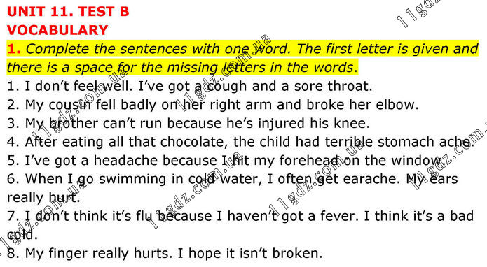 UNIT 11. TEST B VOCABULARY 1. Complete the sentences with one word. The first letter is given and there is a space for the missing letters in the words. 1. I don’t feel well. I’ve got a cough and a sore throat. 2. My cousin fell badly on her right arm and broke her elbow. 3. My brother can’t run because he’s injured his knee. 4. After eating all that chocolate, the child had terrible stomach ache. 5. I’ve got a headache because I hit my forehead on the window. 6. When I go swimming in cold water, I often get earache. My ears really hurt. 7. I don’t think it’s flu because I haven’t got a fever. I think it’s a bad cold. 8. My finger really hurts. I hope it isn’t broken.