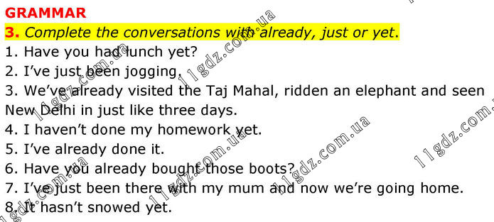 GRAMMAR 3. Complete the conversations with already, just or yet. 1. Have you had lunch yet? 2. I’ve just been jogging. 3. We’ve already visited the Taj Mahal, ridden an elephant and seen New Delhi in just like three days. 4. I haven’t done my homework yet. 5. I’ve already done it. 6. Have you already bought those boots? 7. I’ve just been there with my mum and now we’re going home. 8. It hasn’t snowed yet.