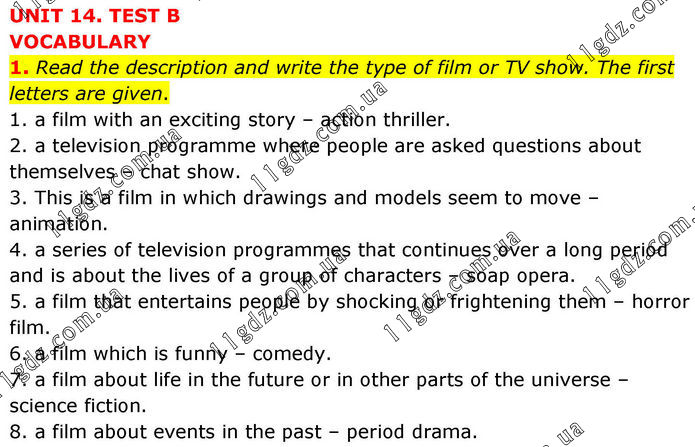 UNIT 14. TEST B VOCABULARY 1. Read the description and write the type of film or TV show. The first letters are given. 1. a film with an exciting story – action thriller. 2. a television programme where people are asked questions about themselves – chat show. 3. This is a film in which drawings and models seem to move – animation. 4. a series of television programmes that continues over a long period and is about the lives of a group of characters – soap opera. 5. a film that entertains people by shocking or frightening them – horror film. 6. a film which is funny – comedy. 7. a film about life in the future or in other parts of the universe – science fiction. 8. a film about events in the past – period drama.