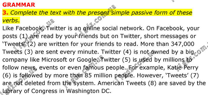 GRAMMAR 3. Complete the text with the present simple passive form of these verbs. Like Facebook, Twitter is an online social network. On Facebook, your posts (1) are read by your friends but on Twitter, short messages or ‘Tweets’ (2) are written for your friends to read. More than 347,000 Tweets (3) are sent every minute. Twitter (4) is not owned by a big company like Microsoft or Google. Twitter (5) is used by millions to follow news, events or even famous people. For example, Katie Perry (6) is followed by more than 85 million people. However, ‘Tweets’ (7) are not deleted from the system. American Tweets (8) are saved by the Library of Congress in Washington DC.