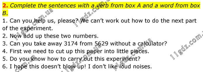 2. Complete the sentences with a verb from box A and a word from box B. 1. Can you help us, please? We can’t work out how to do the next part of the experiment. 2. Now add up these two numbers. 3. Can you take away 3174 from 5629 without a calculator? 4. First we need to cut up this paper into little pieces. 5. Do you know how to carry out this experiment? 6. I hope this doesn’t blow up! I don’t like loud noises.