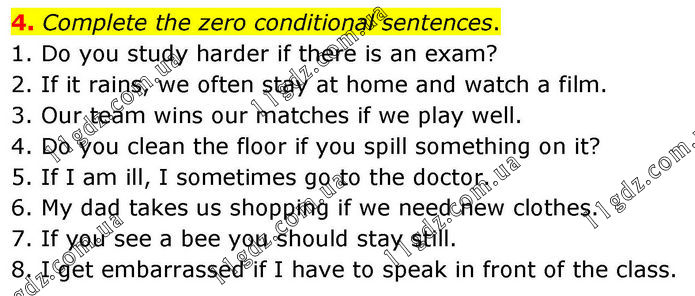 4. Complete the zero conditional sentences. 1. Do you study harder if there is an exam? 2. If it rains, we often stay at home and watch a film. 3. Our team wins our matches if we play well. 4. Do you clean the floor if you spill something on it? 5. If I am ill, I sometimes go to the doctor. 6. My dad takes us shopping if we need new clothes. 7. If you see a bee you should stay still. 8. I get embarrassed if I have to speak in front of the class.