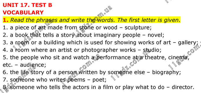 UNIT 17. TEST B VOCABULARY 1. Read the phrases and write the words. The first letter is given. 1. a piece of art made from stone or wood – sculpture; 2. a book that tells a story about imaginary people – novel; 3. a room or a building which is used for showing works of art – gallery; 4. a room where an artist or photographer works – studio; 5. the people who sit and watch a performance at a theatre, cinema, etc. – audience; 6. the life story of a person written by someone else – biography; 7. someone who writes poems – poet; 8. someone who tells the actors in a film or play what to do – director.