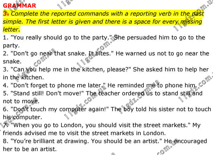 GRAMMAR 3. Complete the reported commands with a reporting verb in the past simple. The first letter is given and there is a space for every missing letter. 1. "You really should go to the party." She persuaded him to go to the party. 2. "Don’t go near that snake. It bites." He warned us not to go near the snake. 3. "Can you help me in the kitchen, please?" She asked him to help her in the kitchen. 4. "Don’t forget to phone me later." He reminded me to phone him. 5. "Stand still! Don’t move!" The teacher ordered us to stand still and not to move. 6. "Don’t touch my computer again!" The boy told his sister not to touch his computer. 7. "When you go to London, you should visit the street markets." My friends advised me to visit the street markets in London. 8. "You’re brilliant at drawing. You should be an artist." He encouraged her to be an artist.
