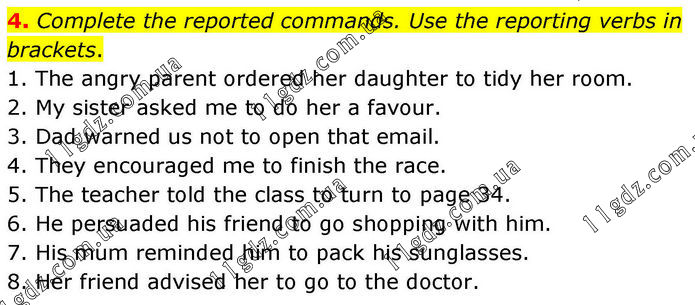 4. Complete the reported commands. Use the reporting verbs in brackets. 1. The angry parent ordered her daughter to tidy her room. 2. My sister asked me to do her a favour. 3. Dad warned us not to open that email. 4. They encouraged me to finish the race. 5. The teacher told the class to turn to page 34. 6. He persuaded his friend to go shopping with him. 7. His mum reminded him to pack his sunglasses. 8. Her friend advised her to go to the doctor.