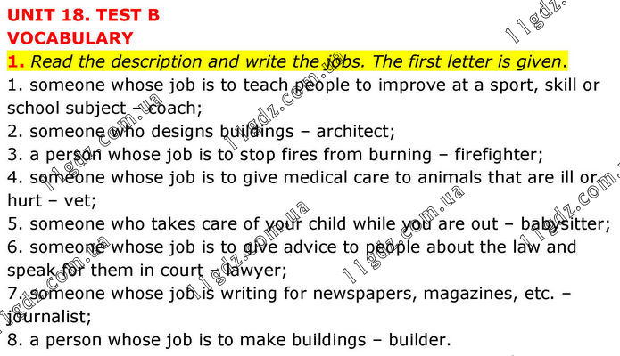 UNIT 18. TEST B VOCABULARY 1. Read the description and write the jobs. The first letter is given. 1. someone whose job is to teach people to improve at a sport, skill or school subject – coach; 2. someone who designs buildings – architect; 3. a person whose job is to stop fires from burning – firefighter; 4. someone whose job is to give medical care to animals that are ill or hurt – vet; 5. someone who takes care of your child while you are out – babysitter; 6. someone whose job is to give advice to people about the law and speak for them in court – lawyer; 7. someone whose job is writing for newspapers, magazines, etc. – journalist; 8. a person whose job is to make buildings – builder.