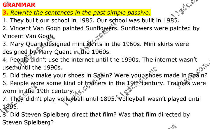 GRAMMAR 3. Rewrite the sentences in the past simple passive. 1. They built our school in 1985. Our school was built in 1985. 2. Vincent Van Gogh painted Sunflowers. Sunflowers were painted by Vincent Van Gogh. 3. Mary Quant designed mini-skirts in the 1960s. Mini-skirts were designed by Mary Quant in the 1960s. 4. People didn’t use the internet until the 1990s. The internet wasn’t used until the 1990s. 5. Did they make your shoes in Spain? Were your shoes made in Spain? 6. People wore some kind of trainers in the 19th century. Trainers were worn in the 19th century. 7. They didn’t play volleyball until 1895. Volleyball wasn’t played until 1895. 8. Did Steven Spielberg direct that film? Was that film directed by Steven Spielberg?