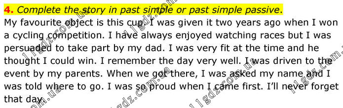 4. Complete the story in past simple or past simple passive. My favourite object is this cup. I was given it two years ago when I won a cycling competition. I have always enjoyed watching races but I was persuaded to take part by my dad. I was very fit at the time and he thought I could win. I remember the day very well. I was driven to the event by my parents. When we got there, I was asked my name and I was told where to go. I was so proud when I came first. I’ll never forget that day.
