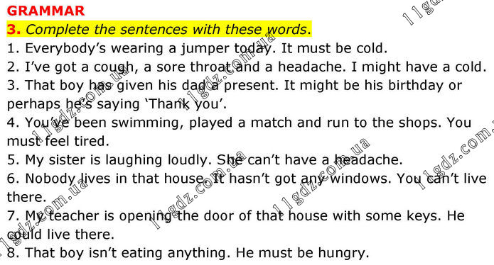 GRAMMAR 3. Complete the sentences with these words. 1. Everybody’s wearing a jumper today. It must be cold. 2. I’ve got a cough, a sore throat and a headache. I might have a cold. 3. That boy has given his dad a present. It might be his birthday or perhaps he’s saying ‘Thank you’. 4. You’ve been swimming, played a match and run to the shops. You must feel tired. 5. My sister is laughing loudly. She can’t have a headache. 6. Nobody lives in that house. It hasn’t got any windows. You can’t live there. 7. My teacher is opening the door of that house with some keys. He could live there. 8. That boy isn’t eating anything. He must be hungry.
