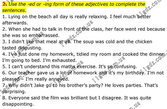 2. Use the -ed or -ing form of these adjectives to complete the sentences. 1. Lying on the beach all day is really relaxing. I feel much better afterwards. 2. When she had to talk in front of the class, her face went red because she was so embarrassed. 3. I didn’t like that meal at all. The soup was cold and the chicken tasted disgusting. 4. I’ve just done my homework, tidied my room and cooked the dinner. I’m going to bed. I’m exhausted. 5. I can’t understand this maths exercise. It’s so confusing. 6. Our teacher gave us a lot of homework and it’s my birthday. I’m not pleased – I’m really annoyed. 7. Why didn’t Jake go to his brother’s party? He loves parties. That’s surprising. 8. Everyone said the film was brilliant but I disagree. It was quite disappointing.