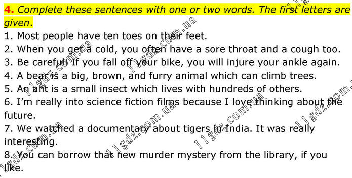 4. Complete these sentences with one or two words. The first letters are given. 1. Most people have ten toes on their feet. 2. When you get a cold, you often have a sore throat and a cough too. 3. Be careful! If you fall off your bike, you will injure your ankle again. 4. A bear is a big, brown, and furry animal which can climb trees. 5. An ant is a small insect which lives with hundreds of others. 6. I’m really into science fiction films because I love thinking about the future. 7. We watched a documentary about tigers in India. It was really interesting. 8. You can borrow that new murder mystery from the library, if you like.