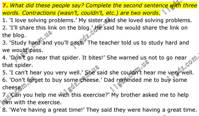7. What did these people say? Complete the second sentence with three words. Contractions (wasn’t, couldn’t, etc.) are two words. 1. ‘I love solving problems.’ My sister said she loved solving problems. 2. ‘I’ll share this link on the blog.’ He said he would share the link on the blog. 3. ‘Study hard and you’ll pass.’ The teacher told us to study hard and we would pass. 4. ‘Don’t go near that spider. It bites!’ She warned us not to go near that spider. 5. ‘I can’t hear you very well.’ She said she couldn’t hear me very well. 6. ‘Don’t forget to buy some cheese.’ Dad reminded me to buy some cheese. 7. ‘Can you help me with this exercise?’ My brother asked me to help him with the exercise. 8. ‘We’re having a great time!’ They said they were having a great time.