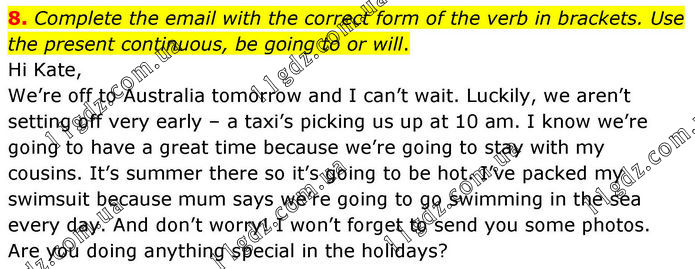 8. Complete the email with the correct form of the verb in brackets. Use the present continuous, be going to or will. Hi Kate, We’re off to Australia tomorrow and I can’t wait. Luckily, we aren’t setting off very early – a taxi’s picking us up at 10 am. I know we’re going to have a great time because we’re going to stay with my cousins. It’s summer there so it’s going to be hot. I’ve packed my swimsuit because mum says we’re going to go swimming in the sea every day. And don’t worry! I won’t forget to send you some photos. Are you doing anything special in the holidays?