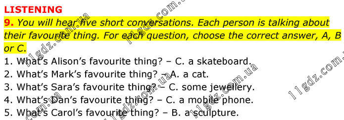 LISTENING 9. You will hear five short conversations. Each person is talking about their favourite thing. For each question, choose the correct answer, A, B or C. 1. What’s Alison’s favourite thing? – C. a skateboard. 2. What’s Mark’s favourite thing? – A. a cat. 3. What’s Sara’s favourite thing? – C. some jewellery. 4. What’s Dan’s favourite thing? – C. a mobile phone. 5. What’s Carol’s favourite thing? – B. a sculpture.