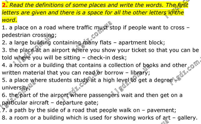2. Read the definitions of some places and write the words. The first letters are given and there is a space for all the other letters in the word. 1. a place on a road where traffic must stop if people want to cross – pedestrian crossing; 2. a large building containing many flats – apartment block; 3. the place at an airport where you show your ticket so that you can be told where you will be sitting – check-in desk; 4. a room or a building that contains a collection of books and other written material that you can read or borrow – library; 5. a place where students study at a high level to get a degree – university; 6. the part of the airport where passengers wait and then get on a particular aircraft – departure gate; 7. a path by the side of a road that people walk on – pavement; 8. a room or a building which is used for showing works of art – gallery.