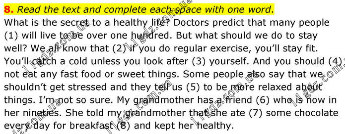 8. Read the text and complete each space with one word. What is the secret to a healthy life? Doctors predict that many people (1) will live to be over one hundred. But what should we do to stay well? We all know that (2) if you do regular exercise, you’ll stay fit. You’ll catch a cold unless you look after (3) yourself. And you should (4) not eat any fast food or sweet things. Some people also say that we shouldn’t get stressed and they tell us (5) to be more relaxed about things. I’m not so sure. My grandmother has a friend (6) who is now in her nineties. She told my grandmother that she ate (7) some chocolate every day for breakfast (8) and kept her healthy.