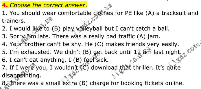 4. Choose the correct answer. 1. You should wear comfortable clothes for PE like (A) a tracksuit and trainers. 2. I would like to (B) play volleyball but I can’t catch a ball. 3. Sorry I’m late. There was a really bad traffic (A) jam. 4. Your brother can’t be shy. He (C) makes friends very easily. 5. I’m exhausted. We didn’t (B) get back until 12 am last night. 6. I can’t eat anything. I (B) feel sick. 7. If I were you, I wouldn’t (C) download that thriller. It’s quite disappointing. 8. There was a small extra (B) charge for booking tickets online.
