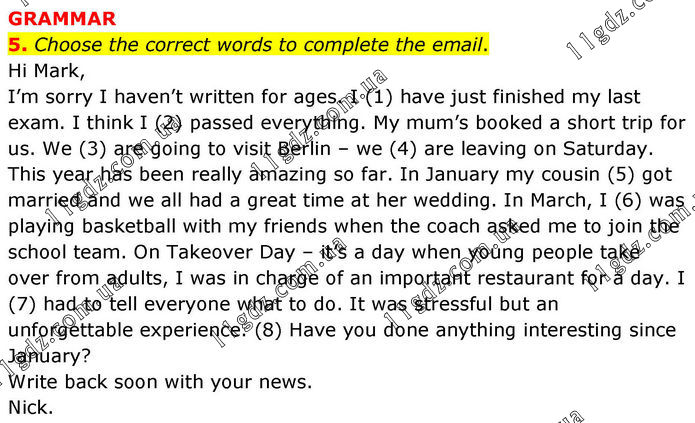 GRAMMAR 5. Choose the correct words to complete the email. Hi Mark, I’m sorry I haven’t written for ages. I (1) have just finished my last exam. I think I (2) passed everything. My mum’s booked a short trip for us. We (3) are going to visit Berlin – we (4) are leaving on Saturday. This year has been really amazing so far. In January my cousin (5) got married and we all had a great time at her wedding. In March, I (6) was playing basketball with my friends when the coach asked me to join the school team. On Takeover Day – it’s a day when young people take over from adults, I was in charge of an important restaurant for a day. I (7) had to tell everyone what to do. It was stressful but an unforgettable experience. (8) Have you done anything interesting since January? Write back soon with your news. Nick.
