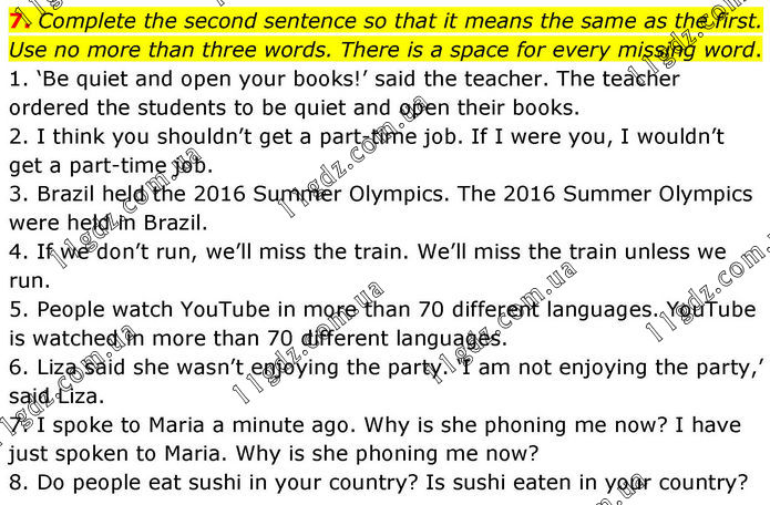 7. Complete the second sentence so that it means the same as the first. Use no more than three words. There is a space for every missing word. 1. ‘Be quiet and open your books!’ said the teacher. The teacher ordered the students to be quiet and open their books. 2. I think you shouldn’t get a part-time job. If I were you, I wouldn’t get a part-time job. 3. Brazil held the 2016 Summer Olympics. The 2016 Summer Olympics were held in Brazil. 4. If we don’t run, we’ll miss the train. We’ll miss the train unless we run. 5. People watch YouTube in more than 70 different languages. YouTube is watched in more than 70 different languages. 6. Liza said she wasn’t enjoying the party. ‘I am not enjoying the party,’ said Liza. 7. I spoke to Maria a minute ago. Why is she phoning me now? I have just spoken to Maria. Why is she phoning me now? 8. Do people eat sushi in your country? Is sushi eaten in your country?