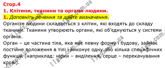 1. Клітини, тканини та органи людини. 1. Доповніть речення та дайте визначення. Організм людини складається з клітин, які входять до складу тканини. Тканини утворюють органи, які об’єднуються у системи органів. Орган – це частина тіла, яка має певну форму і будову, займає постійне положення в тілі і виконує одну або кілька специфічних функцій (наприклад: нірки – виділення, серце – перекачування крові).