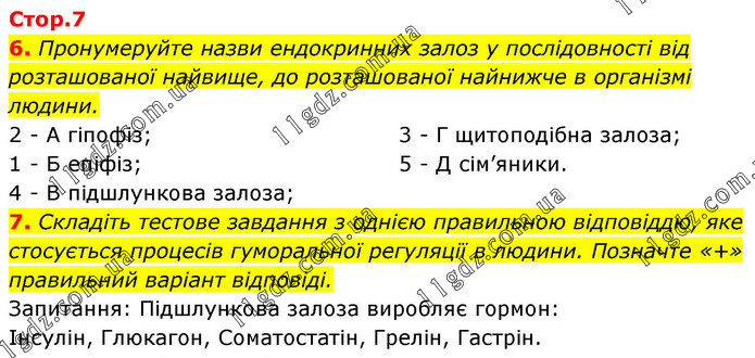 6. Пронумеруйте назви ендокринних залоз у послідовності від розташованої найвище, до розташованої найнижче в організмі людини. 2 - А гіпофіз; 1 - Б епіфіз; 4 - В підшлункова залоза; 3 - Г щитоподібна залоза; 5 - Д сім’яники. 7. Складіть тестове завдання з однією правильною відповіддю, яке стосується процесів гуморальної регуляції в людини. Позначте «+» правильний варіант відповіді. Запитання: Підшлункова залоза виробляє гормон: Інсулін, Глюкагон, Соматостатін, Грелін, Гастрін.