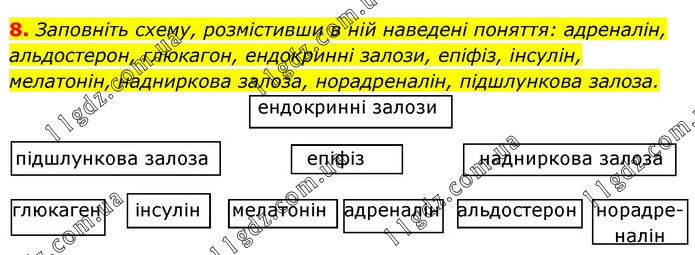 Заповніть схему, розмістивши в ній наведені поняття: адреналін, альдостерон, глюкагон, ендокринні залози, епіфіз, інсулін, мелатонін, надниркова залоза, норадреналін, підшлункова залоза.