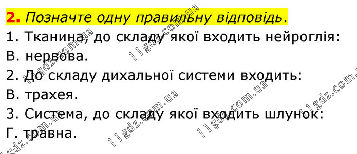 2. Позначте одну правильну відповідь. 1. Тканина, до складу якої входить нейроглія: В. нервова. 2. До складу дихальної системи входить: В. трахея. 3. Система, до складу якої входить шлунок: Г. травна.