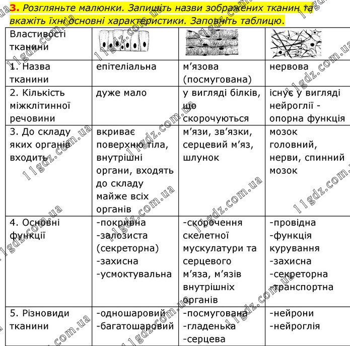 3. Розгляньте малюнки. Запишіть назви зображених тканин та вкажіть їхні основні характеристики. Заповніть таблицю.