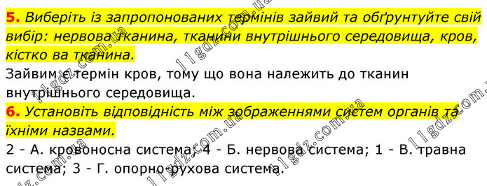 5. Виберіть із запропонованих термінів зайвий та обґрунтуйте свій вибір: нервова тканина, тканини внутрішнього середовища, кров, кістко ва тканина. Зайвим є термін кров, тому що вона належить до тканин внутрішнього середовища. 6. Установіть відповідність між зображеннями систем органів та їхніми назвами. 2 - А. кровоносна система; 4 - Б. нервова система; 1 - В. травна система; 3 - Г. опорно-рухова система.