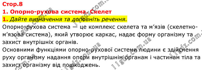 1. Опорно-рухова система. Скелет 1. Дайте визначення та доповніть речення. Опорно-рухова система — це комплекс скелета та м’язів (скелетно-м’язова система), який утворює каркас, надає форму організму та захист внутрішніх органів. Основними функціями опорно-рухової системи людини є здійснення руху організму надання опори внутрішнім органам і частинам тіла та захист організму від пошкоджень.