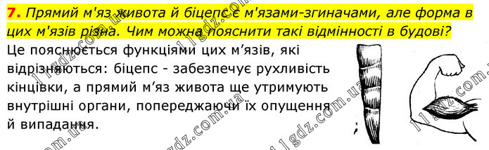 Прямий м'яз живота й біцепс є м'язами-згиначами, але форма в цих м'язів різна. Чим можна пояснити такі відмінності в будові? Це пояснюється функціями цих м’язів, які відрізняються: біцепс - забезпечує рухливість кінцівки, а прямий м’яз живота ще утримують внутрішні органи, попереджаючи їх опущення й випадання.