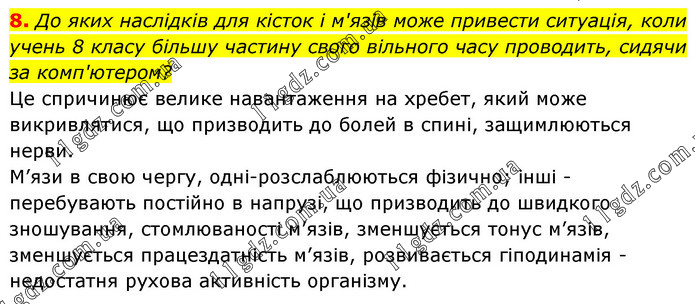 До яких наслідків для кісток і м'язів може привести ситуація, коли учень 8 класу більшу частину свого вільного часу проводить, сидячи за комп'ютером? Це спричинює велике навантаження на хребет, який може викривлятися, що призводить до болей в спині, защимлюються нерви. М’язи в свою чергу, одні-розслаблюються фізично; інші - перебувають постійно в напрузі, що призводить до швидкого зношування, стомлюваності м’язів, зменшується тонус м’язів, зменшується працездатність м’язів, розвивається гіподинамія - недостатня рухова активність організму.