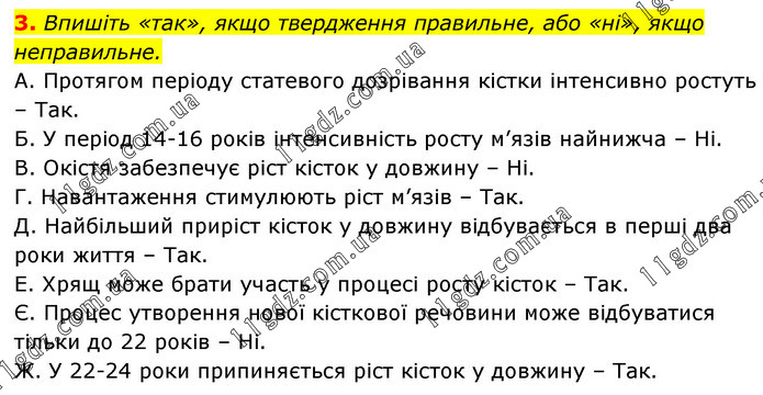 Впишіть «так», якщо твердження правильне, або «ні», якщо неправильне. А. Протягом періоду статевого дозрівання кістки інтенсивно ростуть – Так. Б. У період 14-16 років інтенсивність росту м’язів найнижча – Ні. В. Окістя забезпечує ріст кісток у довжину – Ні. Г. Навантаження стимулюють ріст м’язів – Так. Д. Найбільший приріст кісток у довжину відбувається в перші два роки життя – Так. Е. Хрящ може брати участь у процесі росту кісток – Так. Є. Процес утворення нової кісткової речовини може відбуватися тільки до 22 років – Ні. Ж. У 22-24 роки припиняється ріст кісток у довжину – Так.