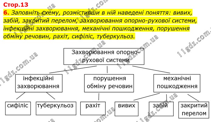Заповніть схему, розмістивши в ній наведені поняття: вивих, забій, закритий перелом, захворювання опорно-рухової системи, інфекційні захворювання, механічні пошкодження, порушення обміну речовин, рахіт, сифіліс, туберкульоз.