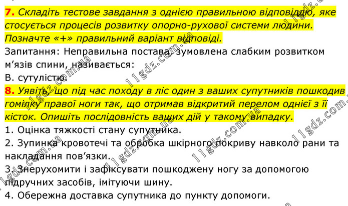 7. Складіть тестове завдання з однією правильною відповіддю, яке стосується процесів розвитку опорно-рухової системи людини. Позначте «+» правильний варіант відповіді. Запитання: Неправильна постава, зумовлена слабким розвитком м’язів спини, називається: В. сутулістю. 8. Уявіть, що під час походу в ліс один з ваших супутників пошкодив гомілку правої ноги так, що отримав відкритий перелом однієї з її кісток. Опишіть послідовність ваших дій у такому випадку. 1. Оцінка тяжкості стану супутника. 2. Зупинка кровотечі та обробка шкірного покриву навколо рани та накладання пов’язки. 3. Знерухомити і зафіксувати пошкоджену ногу за допомогою підручних засобів, імітуючи шину. 4. Обережна доставка супутника до пункту допомоги.