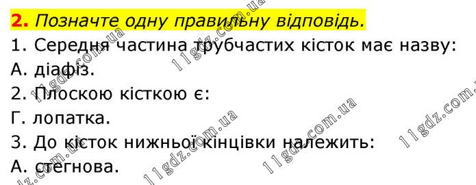2. Позначте одну правильну відповідь. 1. Середня частина трубчастих кісток має назву: А. діафіз. 2. Плоскою кісткою є: Г. лопатка. 3. До кісток нижньої кінцівки належить: А. стегнова.
